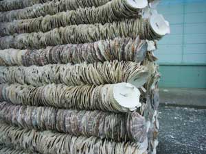 会場の外にこういう貝をひもに通して束ねたやつがサイロのように積んであった。